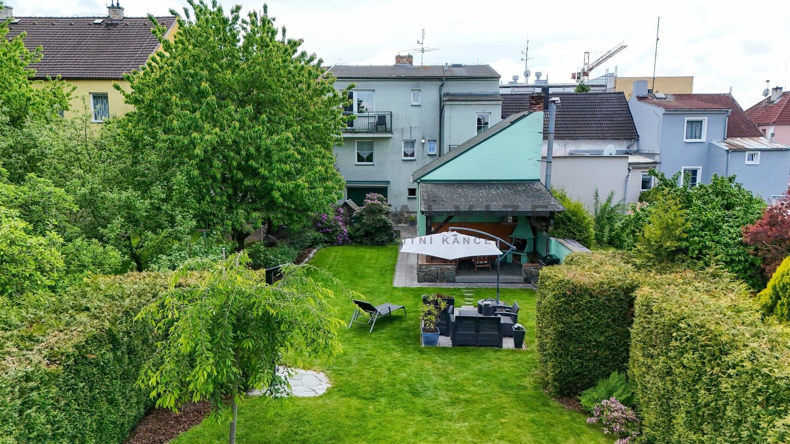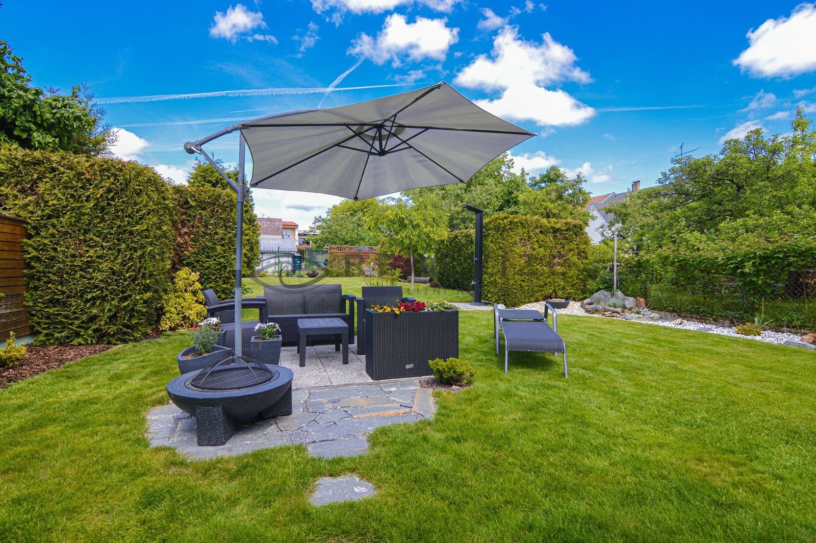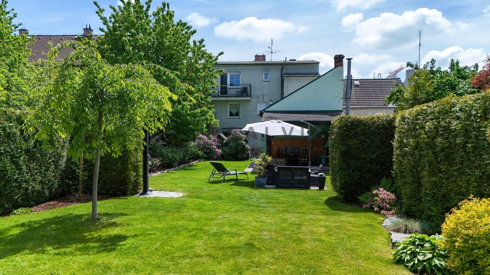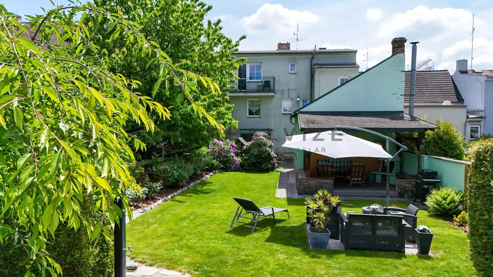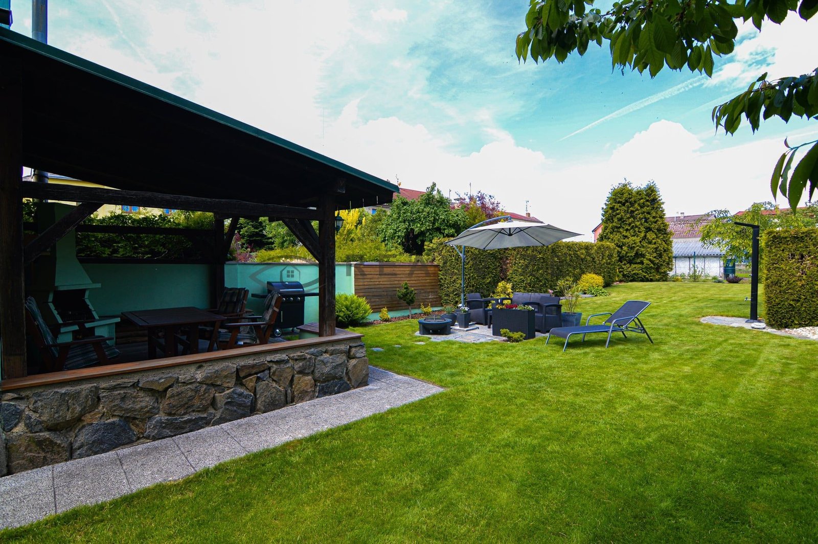 Nemovitost zaujme na první pohled svou pečlivě udržovanou zahradou, která poskytuje příjemné soukromí díky vzrostlé zeleni a okrasným dřevinám. V zahradě se nachází kryté venkovní posezení s krbem a grilem, ideální pro letní večery s rodinou či přáteli. Dále zde najdete relaxační zónu se zahradním nábytkem a slunečníkem, stejně jako vydlážděný dvůr s okrasnými prvky a vlastní studnu.
