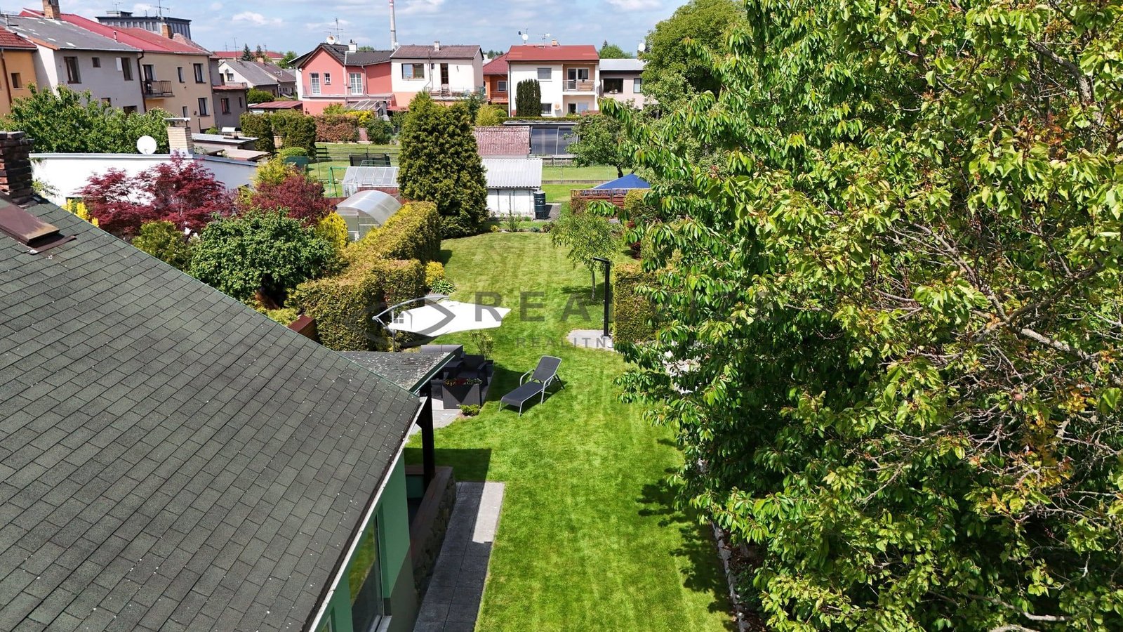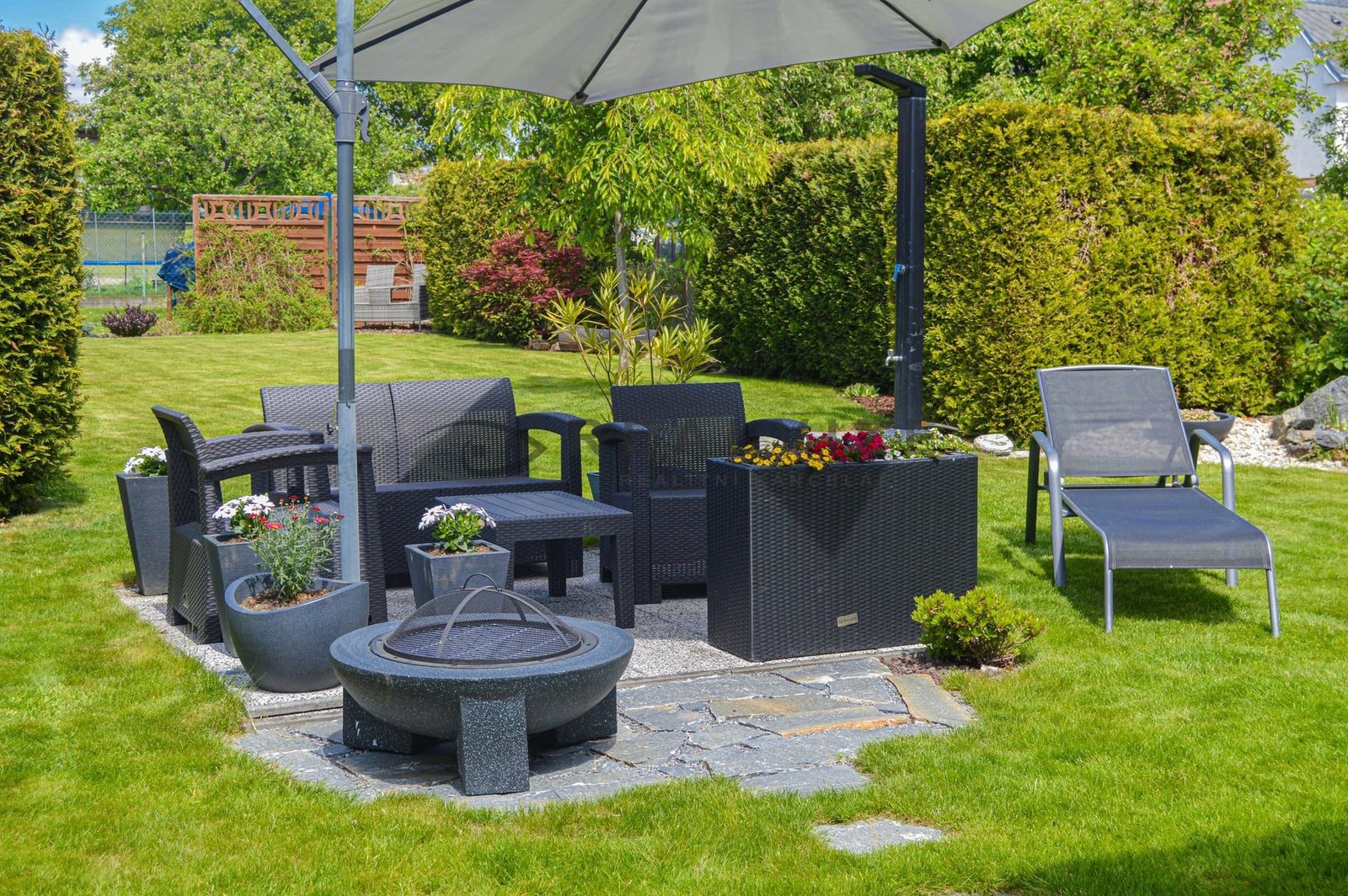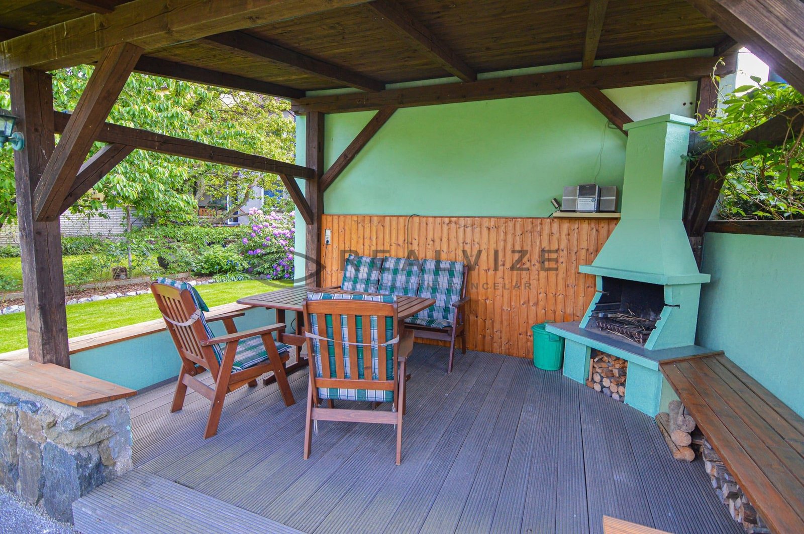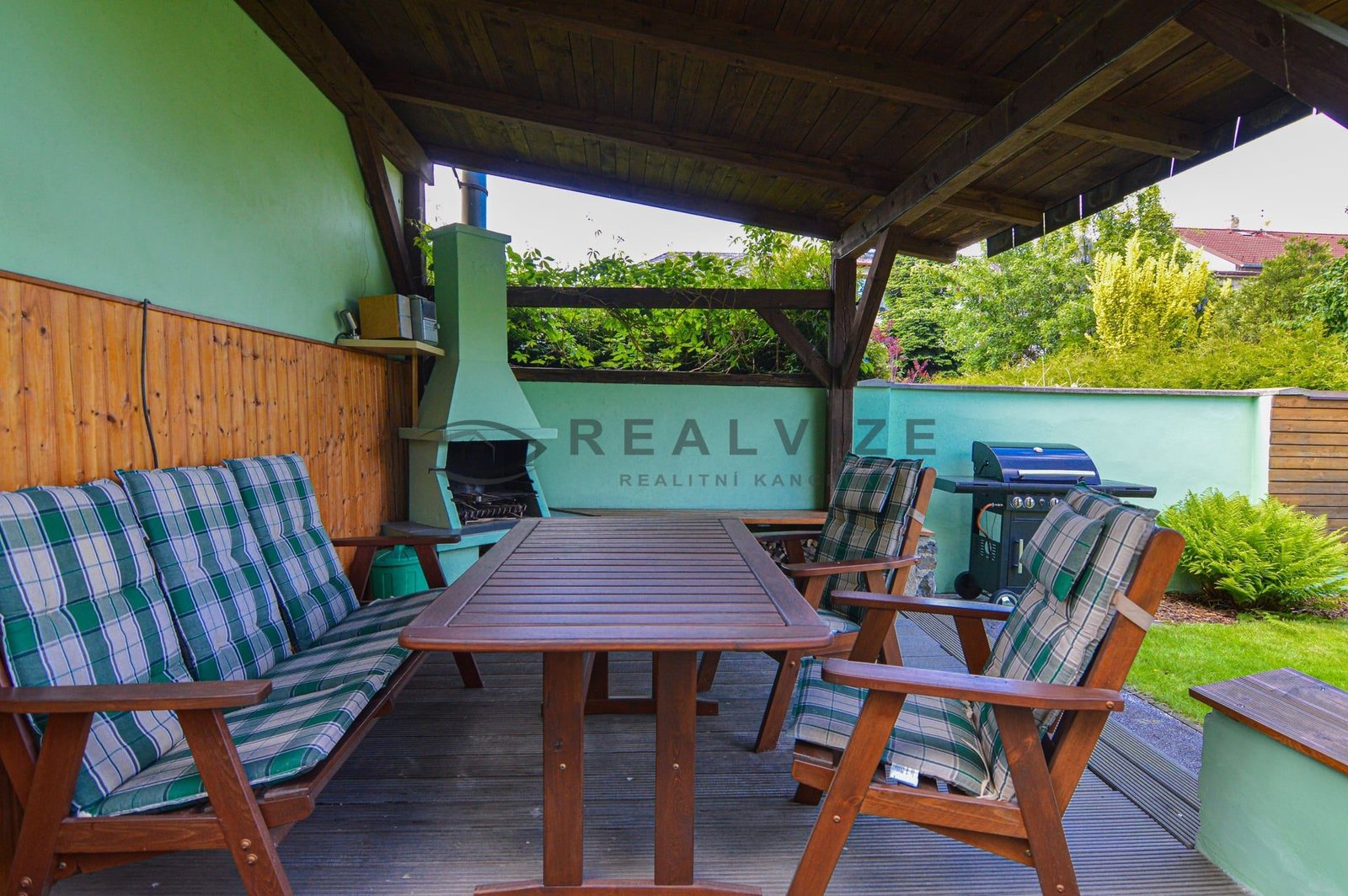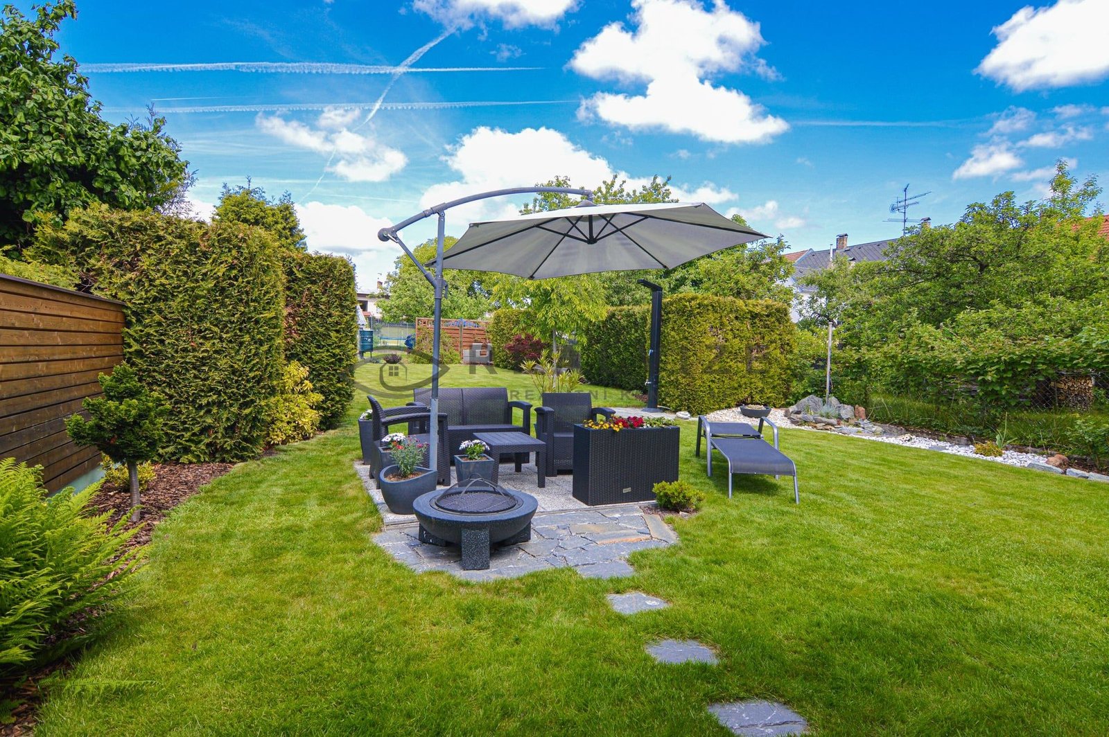 Nemovitost zaujme na první pohled svou pečlivě udržovanou zahradou, která poskytuje příjemné soukromí díky vzrostlé zeleni a okrasným dřevinám. V zahradě se nachází kryté venkovní posezení s krbem a grilem, ideální pro letní večery s rodinou či přáteli. Dále zde najdete relaxační zónu se zahradním nábytkem a slunečníkem, stejně jako vydlážděný dvůr s okrasnými prvky a vlastní studnu.