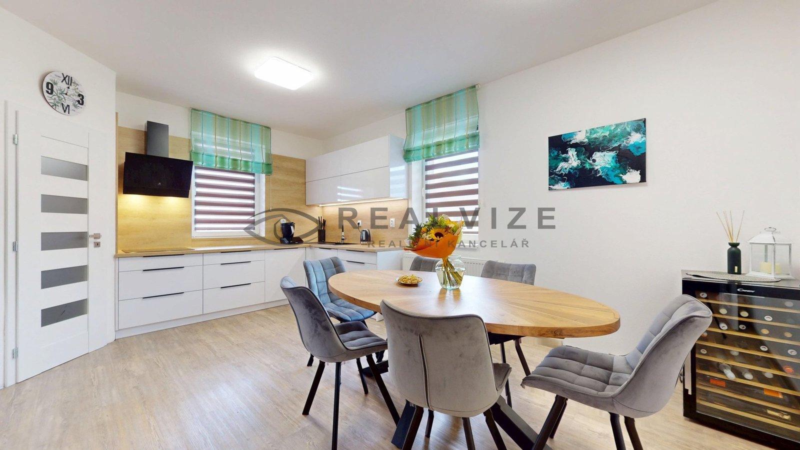 Interiér domu působí velmi vzdušně a příjemně. Dominantou je moderní kuchyně s dostatkem pracovního prostoru, která plynule navazuje na jídelní část a obývací prostor. Velká okna zajišťují dostatek denního světla a zároveň vytváří příjemnou atmosféru celého domu.